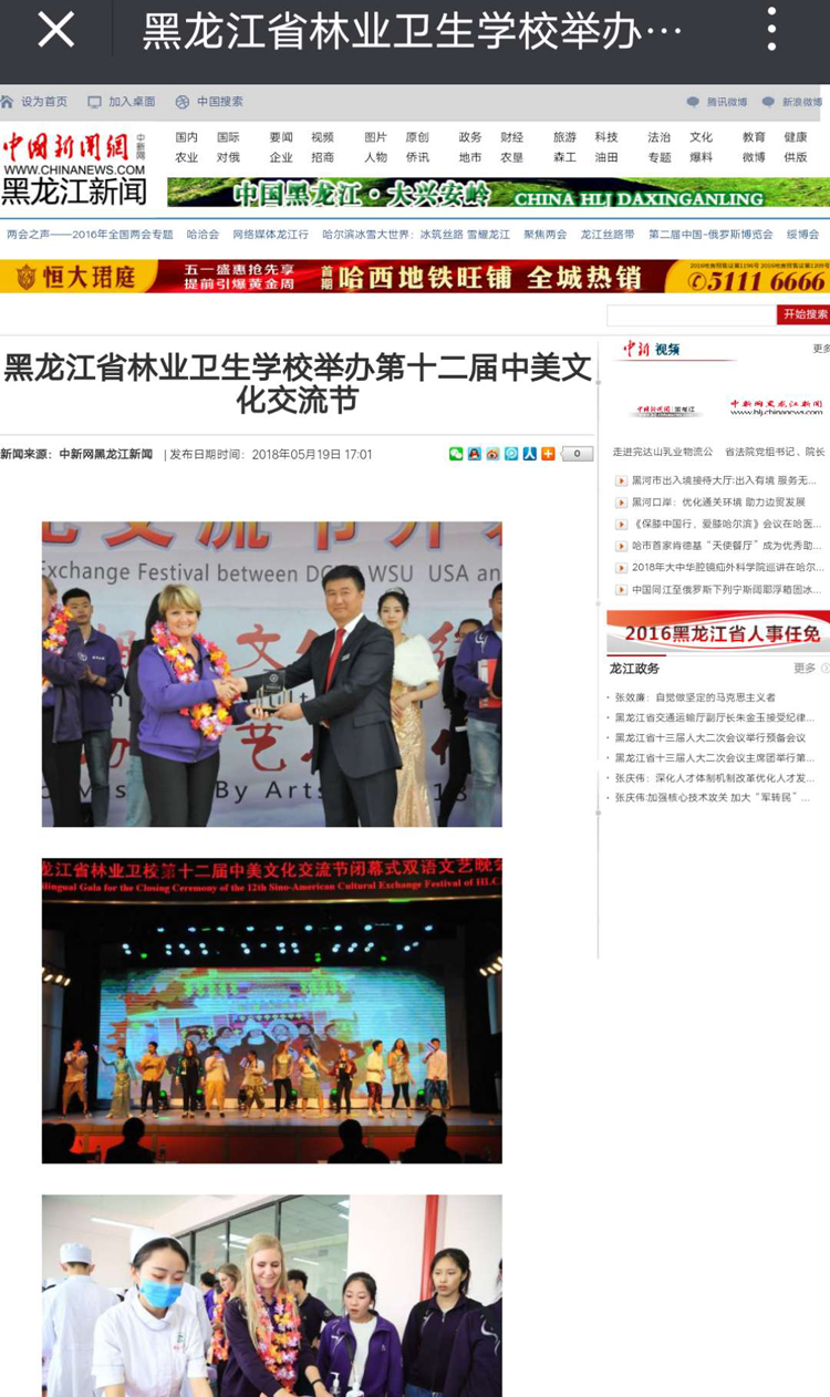 據(jù)黑龍江省林業(yè)衛(wèi)生學校19日消息,自2006年開始,黑龍江省林業(yè)衛(wèi)生學校每年舉辦一次與韋伯大學的中美兩校文化交流節(jié)。近日,第十二屆文化交流活動勝利閉幕。本屆交流節(jié)期間,來自美國韋伯大學的23名師生分別在佳木斯市和雙鴨山市展開中華文化之旅,感受了中醫(yī)技術(shù)的神奇,體驗中國茶藝、書法和繪畫,開展醫(yī)療便民服務(wù),參觀歷史博物館,品嘗中國菜肴,與省林業(yè)衛(wèi)校學生同臺演出。為期四天的中美兩校文化交流讓兩校師生感觸頗深:增進合作有助于實現(xiàn)職業(yè)教育國際化,和平友好有利于實現(xiàn)互利共贏。