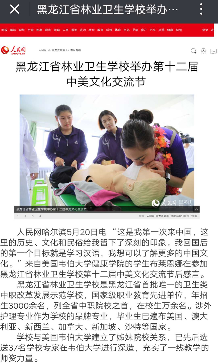 人民網(wǎng)哈爾濱5月20日電 “這是我第一次來中國,這里的歷史、文化和民俗給我留下了深刻的印象。我回國后的第一個(gè)目標(biāo)就是學(xué)習(xí)漢語,我想可以了解更多的中國文化。”來自美國韋伯大學(xué)健康學(xué)院的學(xué)生布萊恩娜在參加黑龍江省林業(yè)衛(wèi)生學(xué)校第十二屆中美文化交流節(jié)后感言。