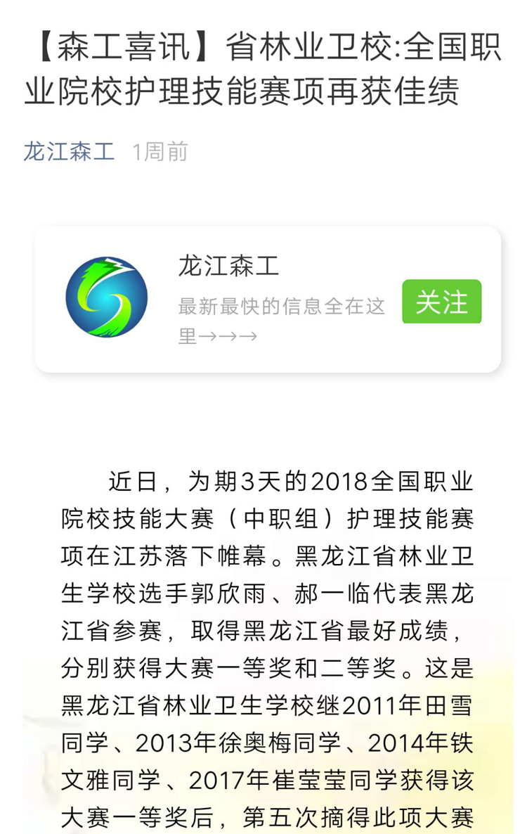 近日,為期3天的2018全國職業(yè)院校技能大賽(中職組)護理技能賽項在江蘇落下帷幕。黑龍江省林業(yè)衛(wèi)生學校選手郭欣雨、郝一臨代表黑龍江省參賽,取得黑龍江省最好成績,分別獲得大賽一等獎和二等獎。這是黑龍江省林業(yè)衛(wèi)生學校繼2011年田雪同學、2013年徐奧梅同學、2014年鐵文雅同學、2017年崔瑩瑩同學獲得該大賽一等獎后,第五次摘得此項大賽桂冠。