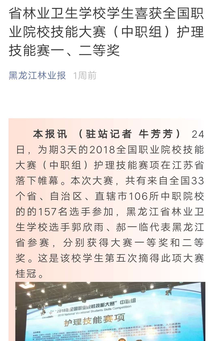 本報(bào)訊 (駐站記者 牛芳芳) 24日,為期3天的2018全國職業(yè)院校技能大賽(中職組)護(hù)理技能賽項(xiàng)在江蘇省落下帷幕。本次大賽,共有來自全國33個(gè)省、自治區(qū)、直轄市106所中職院校的的157名選手參加,黑龍江省林業(yè)衛(wèi)生學(xué)校選手郭欣雨、郝一臨代表黑龍江省參賽,分別獲得大賽一等獎(jiǎng)和二等獎(jiǎng)。這是該校學(xué)生第五次摘得此項(xiàng)大賽桂冠。