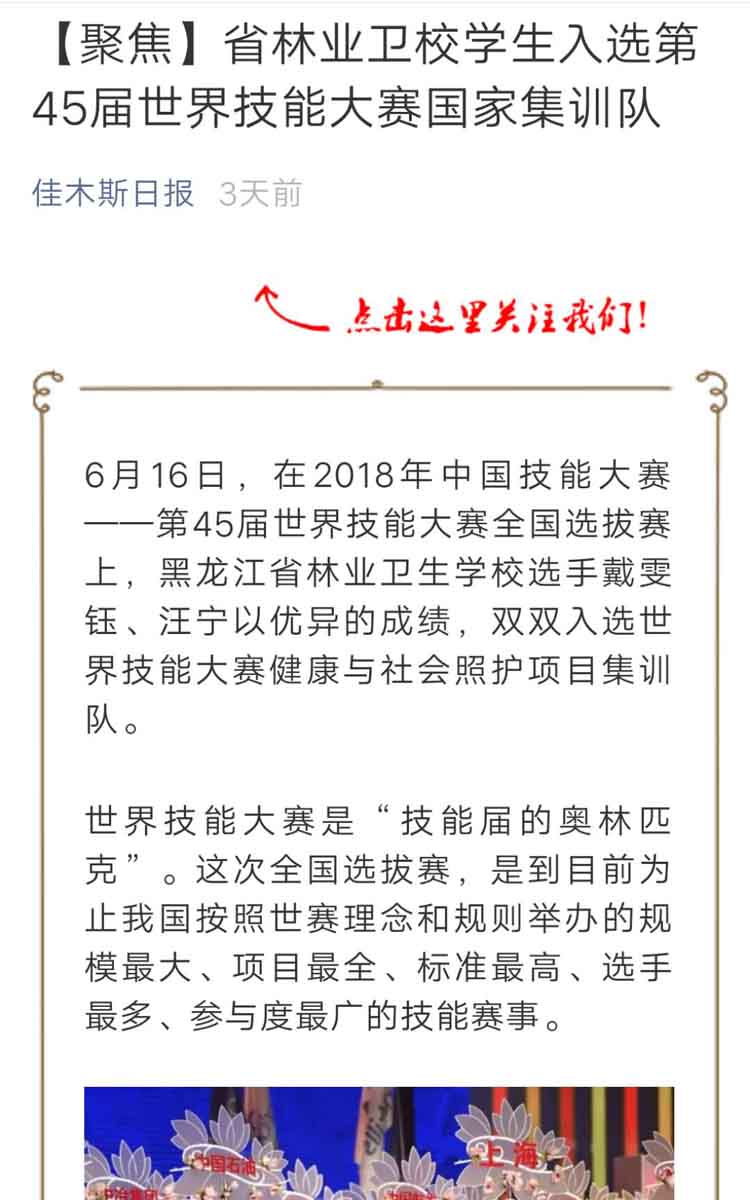 6月16日,在2018年中國(guó)技能大賽——第45屆世界技能大賽全國(guó)選拔賽上,黑龍江省林業(yè)衛(wèi)生學(xué)校選手戴雯鈺、汪寧以?xún)?yōu)異的成績(jī),雙雙入選世界技能大賽健康與社會(huì)照護(hù)項(xiàng)目集訓(xùn)隊(duì)。