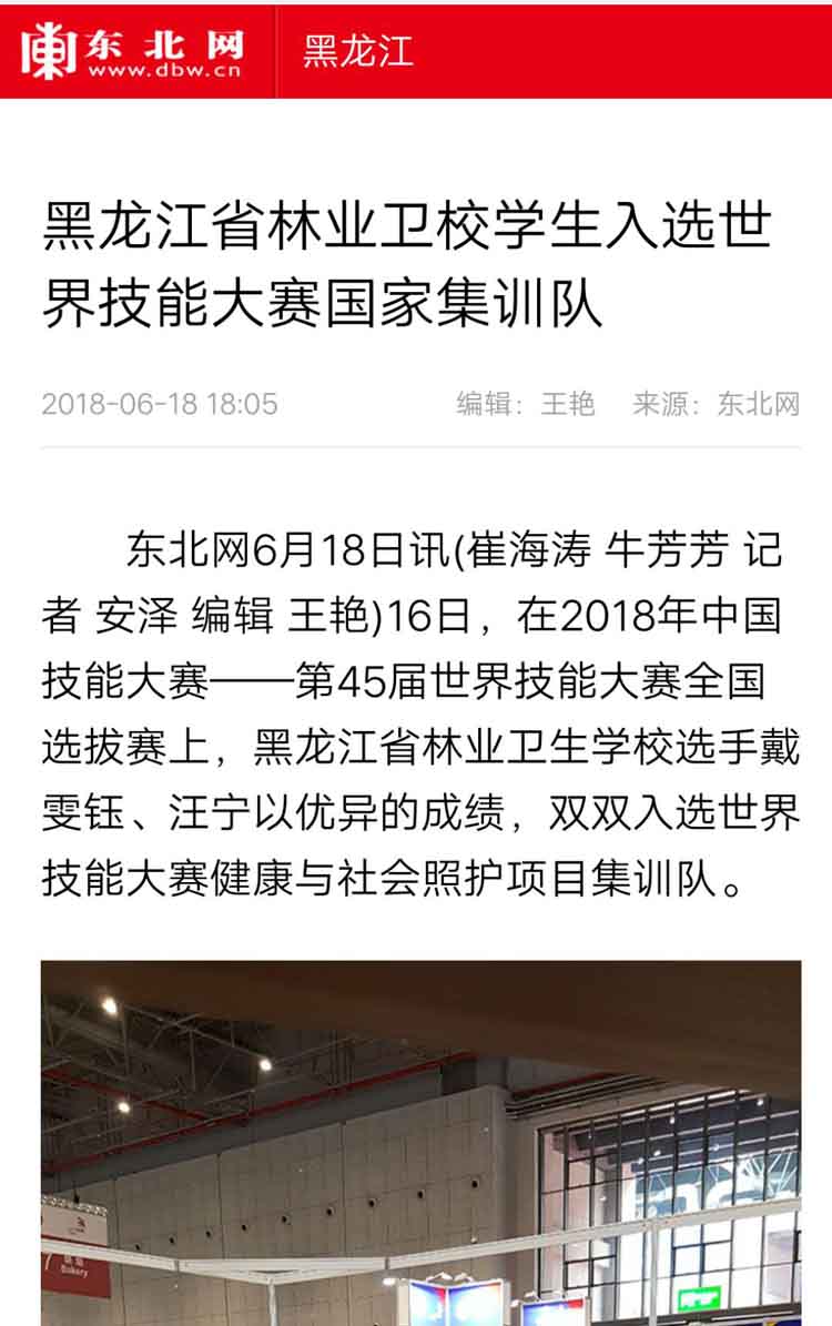 東北網(wǎng)6月18日訊(崔海濤 牛芳芳 記者 安澤 編輯 王艷)16日,在2018年中國(guó)技能大賽——第45屆世界技能大賽全國(guó)選拔賽上,黑龍江省林業(yè)衛(wèi)生學(xué)校選手戴雯鈺、汪寧以優(yōu)異的成績(jī),雙雙入選世界技能大賽健康與社會(huì)照護(hù)項(xiàng)目集訓(xùn)隊(duì)。