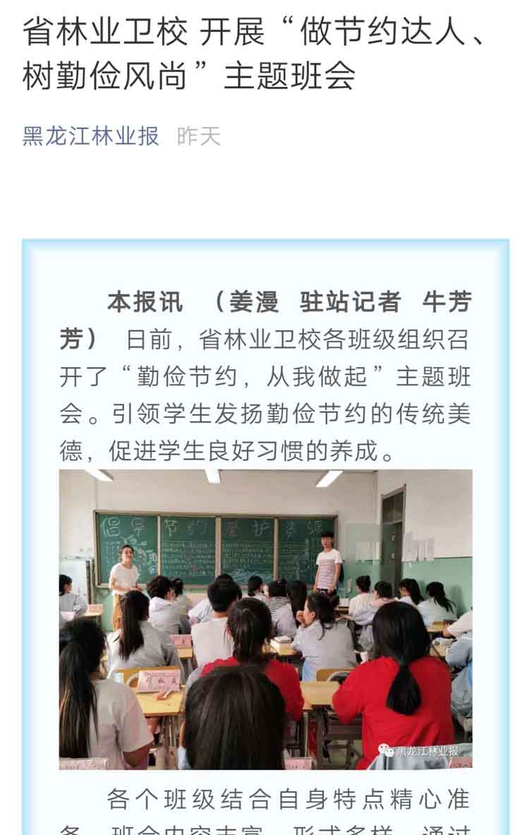 本報訊 (姜漫 駐站記者 牛芳芳) 日前,省林業(yè)衛(wèi)校各班級組織召開了“勤儉節(jié)約,從我做起”主題班會。引領(lǐng)學生發(fā)揚勤儉節(jié)約的傳統(tǒng)美德,促進學生良好習慣的養(yǎng)成。