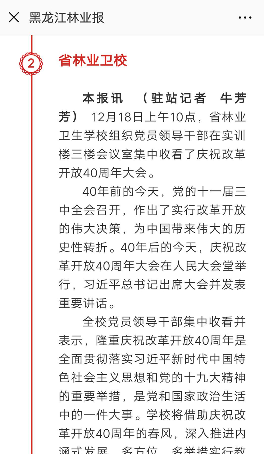 本報訊 (駐站記者 牛芳芳) 12月18日上午10點,省林業(yè)衛(wèi)生學(xué)校組織黨員領(lǐng)導(dǎo)干部在實訓(xùn)樓三樓會議室集中收看了慶祝改革開放40周年大會。