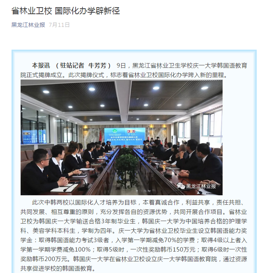 幾年來(lái),省林業(yè)衛(wèi)校在開(kāi)辦涉外英語(yǔ)、德語(yǔ)方向?qū)I(yè)成功之后,借助本校優(yōu)秀的師資力量,接待世界各國(guó)AFS留學(xué)生,學(xué)校已經(jīng)開(kāi)始走向國(guó)際化。此次與韓國(guó)慶一大學(xué)合作辦學(xué),將為省林業(yè)衛(wèi)校國(guó)際化辦學(xué)再添濃墨重彩的一筆。