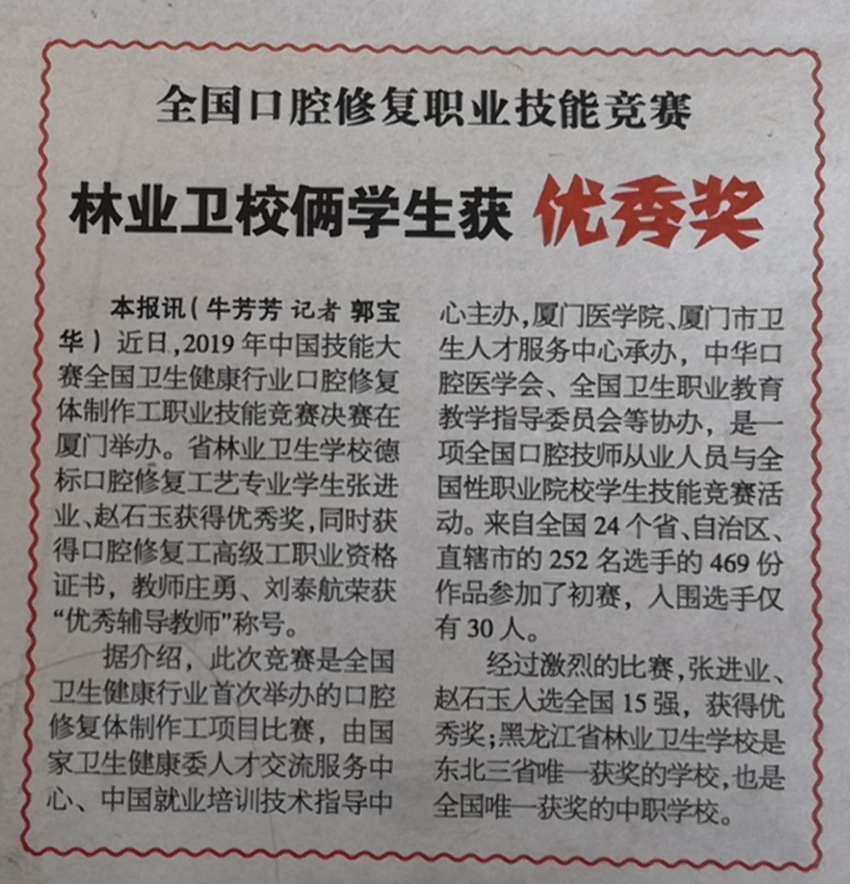 【三江晚報】全國口腔修復(fù)職業(yè)技能競賽林業(yè)衛(wèi)校倆學(xué)生獲優(yōu)秀獎