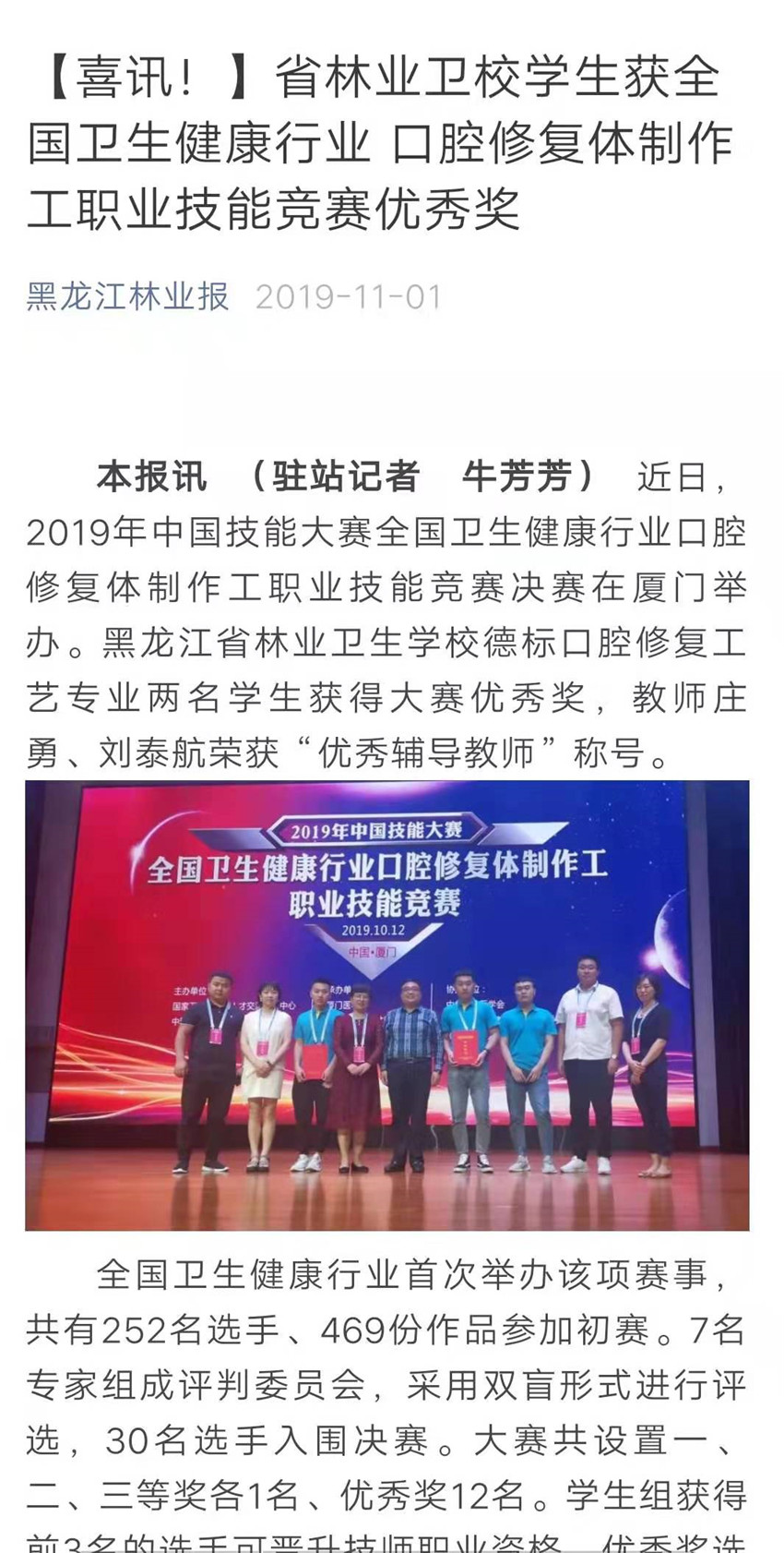 【黑龍江林業(yè)報】省林業(yè)衛(wèi)校學(xué)生獲全國衛(wèi)生健康行業(yè)口腔修復(fù)體制作工職業(yè)技能競賽優(yōu)秀獎