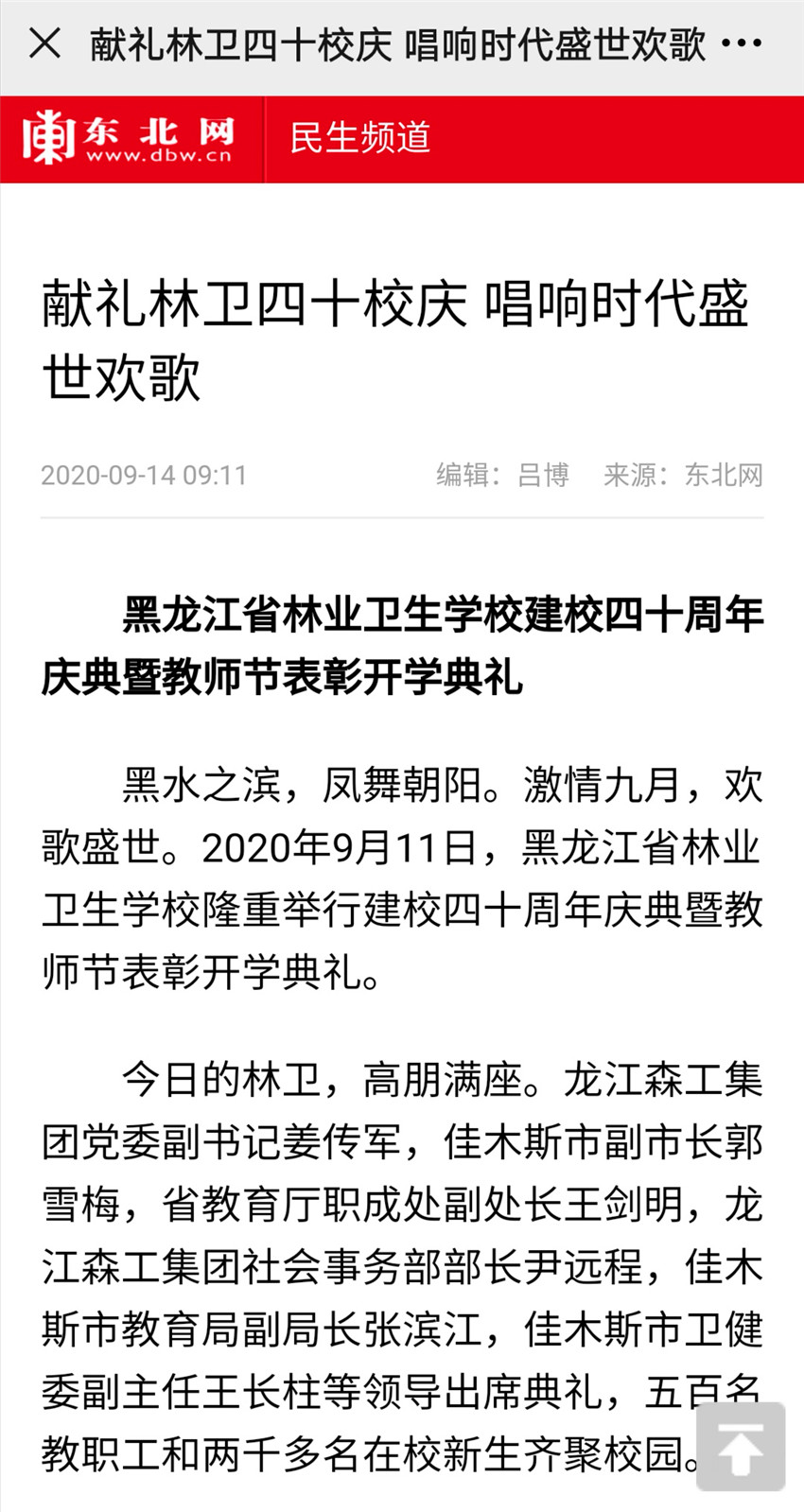 黑水之濱,鳳舞朝陽。激情九月,歡歌盛世。2020年9月11日,黑龍江省林業(yè)衛(wèi)生學校隆重舉行建校四十周年慶典暨教師節(jié)表彰開學典禮。