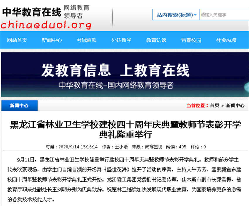 【中華教育在線網(wǎng)】黑龍江省林業(yè)衛(wèi)生學(xué)校建校四十周年慶典暨教師節(jié)表彰開學(xué)典禮隆重舉行 |