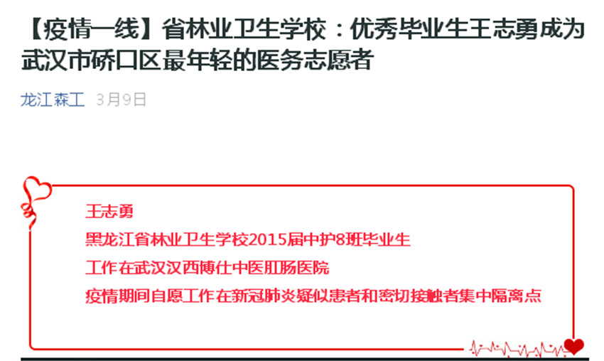 【龍江森工】【疫情一線】省林業(yè)衛(wèi)生學校:優(yōu)秀畢業(yè)生王志勇成為武漢市硚口區(qū)最年輕的醫(yī)務志愿者