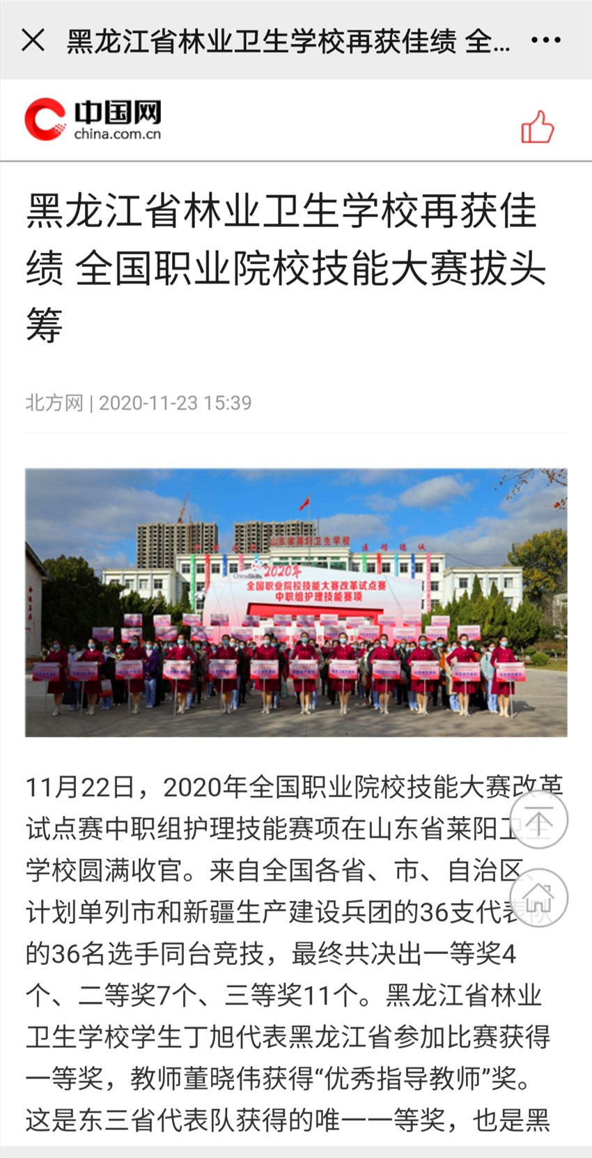 【中國網(wǎng)】黑龍江省林業(yè)衛(wèi)生學(xué)校再獲佳績(jī) 全國職業(yè)院校技能大賽拔頭籌 |