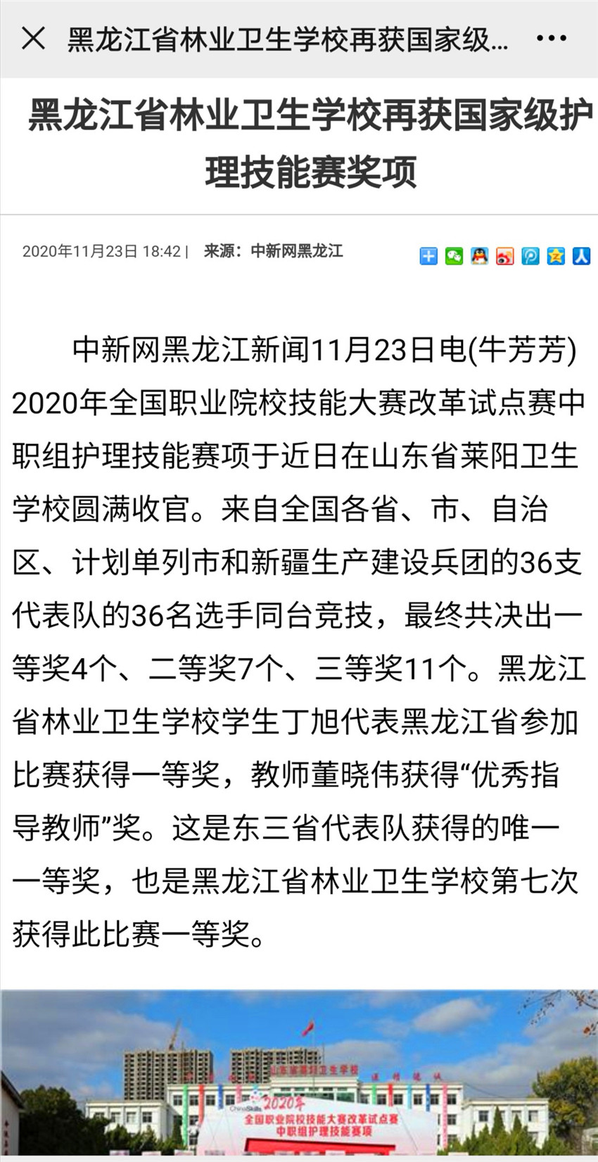 【中新網(wǎng)】黑龍江省林業(yè)衛(wèi)生學(xué)校再獲國家級護(hù)理技能賽獎項(xiàng) |