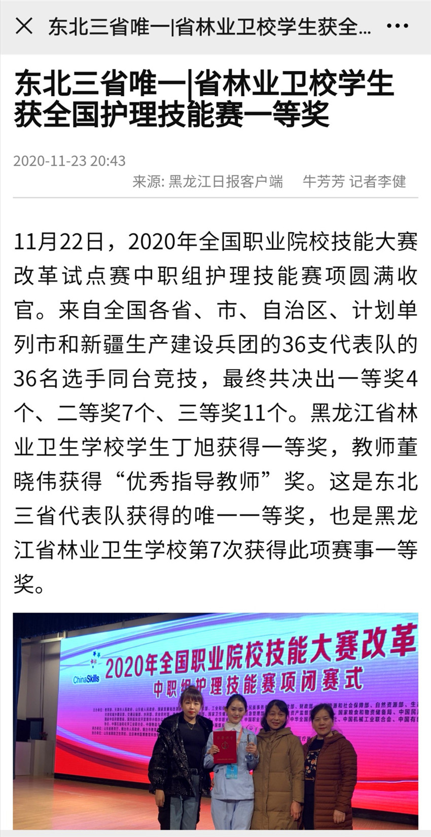 【黑龍江日報(bào)】東北三省唯一|省林業(yè)衛(wèi)校學(xué)生獲全國護(hù)理技能賽一等獎