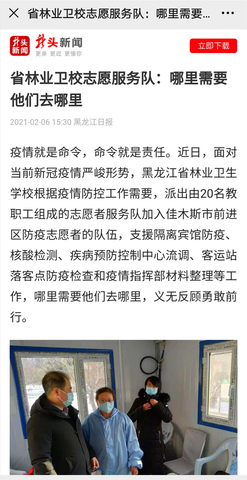 疫情就是命令,命令就是責(zé)任。近日,面對當(dāng)前新冠疫情嚴(yán)峻形勢,黑龍江省林業(yè)衛(wèi)生學(xué)校根據(jù)疫情防控工作需要,派出由20名教職工組成的志愿者服務(wù)隊加入佳木斯市前進(jìn)區(qū)防疫志愿者的隊伍,支援隔離賓館防疫、核酸檢測、疾病預(yù)防控制中心流調(diào)、客運(yùn)站落客點(diǎn)防疫檢查和疫情指揮部材料整理等工作,哪里需要他們?nèi)ツ睦,義無反顧勇敢前行。 疫情就是命令,命令就是責(zé)任 省內(nèi)多地出現(xiàn)疫情以來,疫情防控形勢復(fù)雜嚴(yán)峻。當(dāng)?shù)弥涯舅故蟹酪咭痪急需志愿者時,黑龍江省林業(yè)衛(wèi)生學(xué)校緊急召開會議,在全校范圍內(nèi)召集了20名責(zé)任心強(qiáng)、身體健康、有奉獻(xiàn)精神、掌握疫情防控知識的教職工。20名志愿者經(jīng)過培訓(xùn)在1月16日全部上崗,投身到防疫志愿者的工作中。他們嚴(yán)格要求自己,認(rèn)真負(fù)責(zé),在工作中任勞任怨,得到了前進(jìn)區(qū)政府和學(xué)校領(lǐng)導(dǎo)的高度認(rèn)可。 防疫工作無大小,前線、后方都關(guān)鍵 孔慶芳是林業(yè)衛(wèi)校辦公室主任、護(hù)理學(xué)科教師,也是這次疫情防控志愿服務(wù)隊的隊長。她不僅要做好疫情指揮部的材料整理工作,還要時刻關(guān)注其他19名教職工的工作、生活、情緒等情況。 當(dāng)?shù)弥酪咭痪物資不足的情況后,孔慶芳馬上與學(xué)校溝通,學(xué)校結(jié)合實際情況立即采購防疫物品,讓志愿者能在安全環(huán)境中工作;當(dāng)?shù)弥綦x賓館有國外返佳人員,她便時刻關(guān)注隔離賓館防疫組每天在工作群中的匯報,叮囑她們一定要做好個人防護(hù);由于疫情指揮部的材料整理工作比較復(fù)雜,有時候要一直電話溝通,所以孔慶芳和同事劉巧玲經(jīng)常都是工作到后半夜。 當(dāng)記者要采訪她們時,她們說得最多的一句話就是:“我們不是前線,我們是后方,不要報道我們。” 疫情當(dāng)前,貢獻(xiàn)不分大小,前線和后方皆重要。 堅守集中隔離點(diǎn),用愛與責(zé)任守護(hù)佳城 李秀茹今年52歲,是護(hù)理學(xué)科教研室主任,也是此次隔離賓館防疫工作組組長,她帶領(lǐng)楊淑靜、張井凡、隋霄、劉浩工作在集中隔離點(diǎn),當(dāng)時入住人員包括國外、省外及省內(nèi)中、高風(fēng)險隔離人員58人。她們負(fù)責(zé)進(jìn)駐和離開人員的登記、隔離人員和工作人員的體溫測量、核酸檢測、血清檢測、所有人員三餐的訂購和發(fā)放、垃圾的分類搬運(yùn)、隔離人員大數(shù)據(jù)的微機(jī)管理、與上級部門及社區(qū)溝通,隨時解決各種突發(fā)事件。 集中隔離點(diǎn)實施三區(qū)、二通道管理,進(jìn)入隔離區(qū)工作前后要穿脫隔離服(包括連體衣褲、鞋套、護(hù)目鏡、手套等)。在隔離區(qū)工作要時刻接觸從省內(nèi)外、國內(nèi)外高風(fēng)險區(qū)域來佳的隔離人員,楊淑靜在分配工作任務(wù)時,主動要求進(jìn)入隔離區(qū)工作,她把個人的安危置之度外,大家都為她甘于奉獻(xiàn)的精神點(diǎn)贊。 隔離賓館的工作讓她們真真正正感受到了一線抗疫人員日夜堅守崗位,不辭辛苦,默默奉獻(xiàn)的精神,讓她們增強(qiáng)了戰(zhàn)勝困難的勇氣和決心。 全力做好各項工作,筑起疫情防控堅固防線 “疫情防控,關(guān)系千家萬戶,如果您沒有極特殊情況請盡量不要外出,謝謝支持配合!”這是流調(diào)人員在接到電話時每天都要重復(fù)的話。 張維君、竇歆和、徐德平、劉金鳳是本次學(xué)校派出到前進(jìn)區(qū)防疫工作隊流調(diào)組成員,負(fù)責(zé)對密切接觸者流行病學(xué)調(diào)查并書寫流調(diào)報告、隔離病人的信息,整理報表,上傳至前進(jìn)區(qū)防疫指揮部。他們深知防疫工作要極其認(rèn)真,和密接者進(jìn)行交流,必須本著對本人和社會負(fù)責(zé)的態(tài)度去工作,不能有半點(diǎn)馬虎。 汪永君、石秀麗、牛繼紅、胡偉佳是客運(yùn)站落客點(diǎn)防疫檢查組成員,對在佳木斯客運(yùn)站落客區(qū)的所有旅客進(jìn)行測溫,并對重點(diǎn)旅客查看核酸報告,登記信息,向相關(guān)人員匯報請示是否同意放行。在這個過程中要對使用老年手機(jī)不能查驗行程碼的旅客,進(jìn)行詳細(xì)登記。在登記過程中,個別旅客不配合,需要耐心與其溝通,講清楚防疫檢查的重要性,取得旅客的配合。 53歲的汪永君為了參加這次防疫工作,犧牲了與丈夫和孩子團(tuán)聚的機(jī)會,但她毫無怨言,覺得這次志愿者做的很有意義,在自己的人生日記中畫上了濃墨重彩的一筆,是難忘的經(jīng)歷。 王慶超、張健富、李國增、孫天龍、丁俊鵬組成了最年輕的核酸檢測志愿者小組,負(fù)責(zé)在核酸檢測點(diǎn)協(xié)助掃碼、測溫、維持秩序、協(xié)助消殺、為居民解答管控措施隔離情況、核酸預(yù)約等工作。“每天的工作都是一樣的流程,過程中最難的就是對抗寒冷,零下二十多攝氏度的氣溫,即使在屋里也感覺冷。但是我覺得大家一起共同努力的日子真好!”王慶超對記者說。 孫天龍的居住地離工作地點(diǎn)較遠(yuǎn),每天他克服路途遙遠(yuǎn),母親生病無人照顧等困難,“舍小家顧大家”出色地完成上級組織交給的任務(wù)。丁俊鵬是小組里年紀(jì)最小的,他說:“工作中經(jīng)常遇到有溝通問題和情