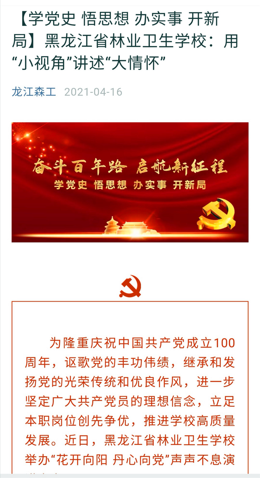 【龍江森工】【學(xué)黨史 悟思想 辦實(shí)事 開新局】黑龍江省林業(yè)衛(wèi)生學(xué)校:用“小視角”講述“大情懷” |