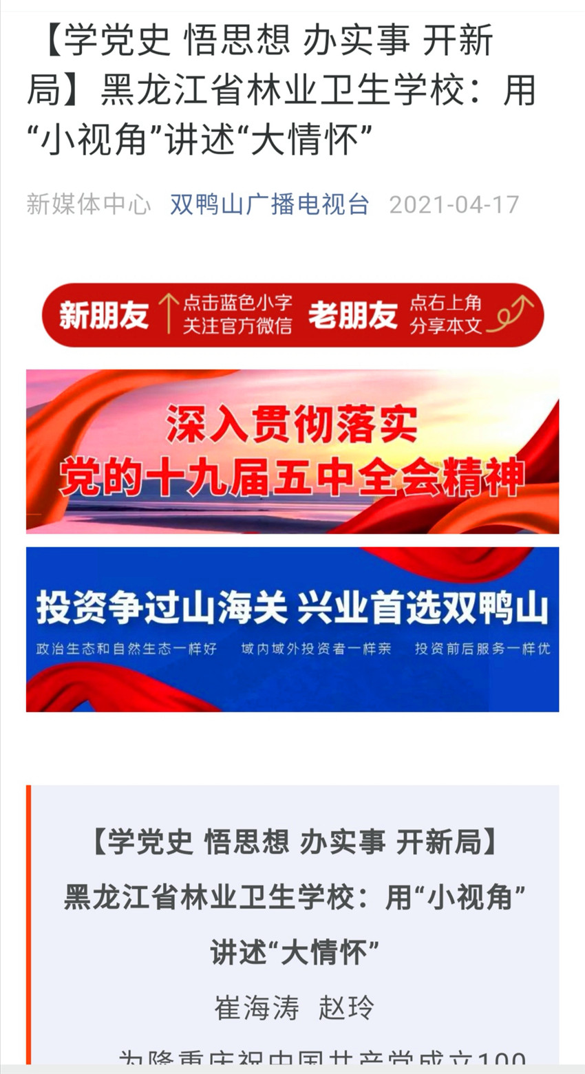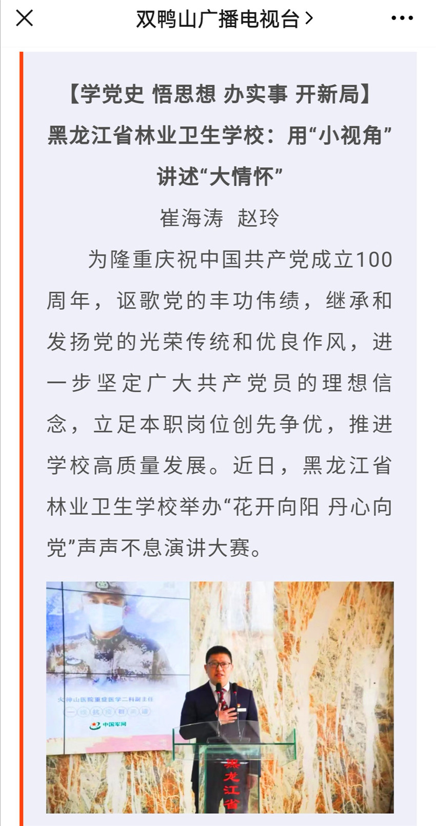 【雙鴨山廣播電視臺(tái)】【學(xué)黨史 悟思想 辦實(shí)事 開(kāi)新局】黑龍江省林業(yè)衛(wèi)生學(xué)校:用“小視角”講述“大情懷” |