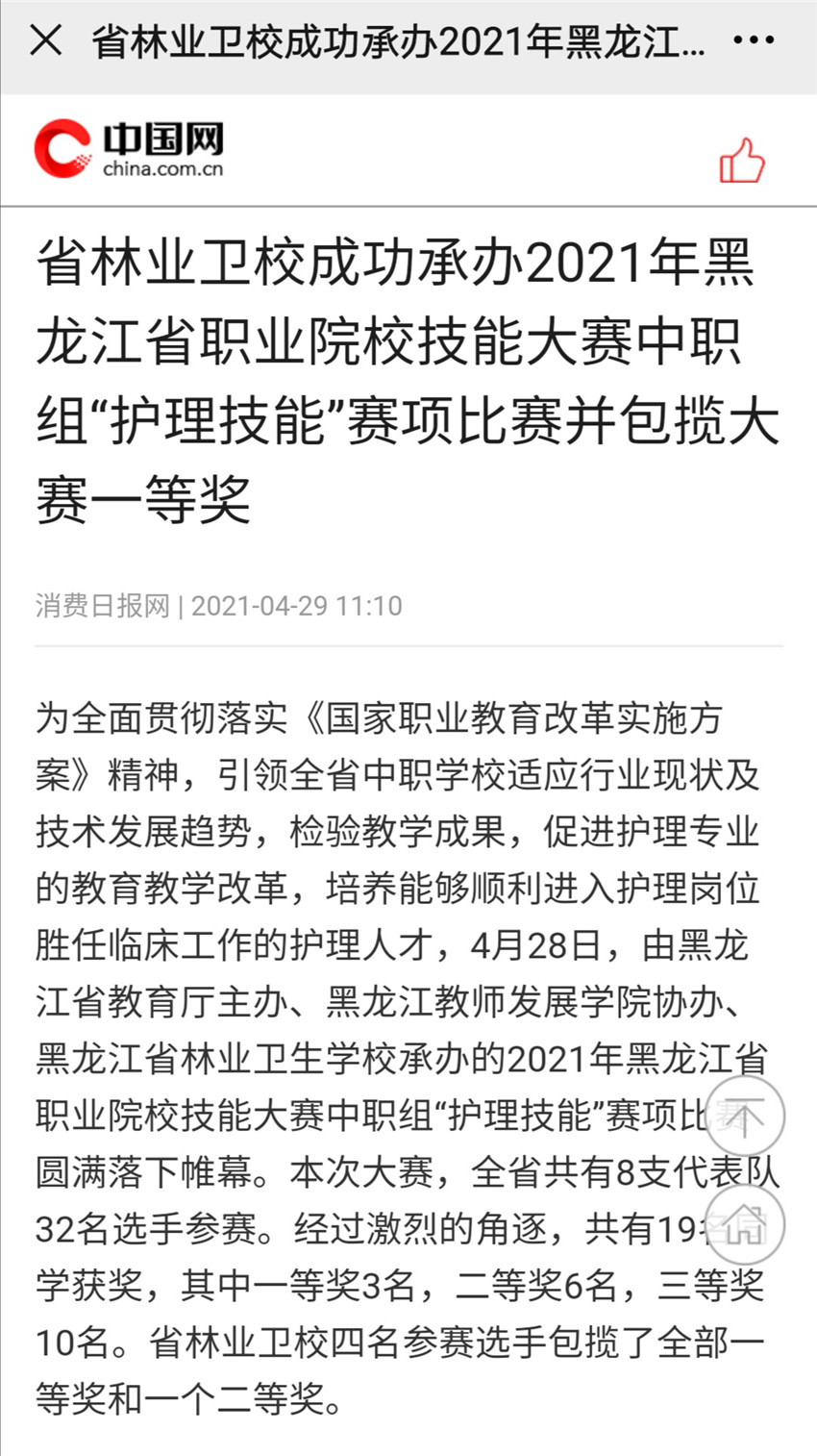 【中國網(wǎng)】省林業(yè)衛(wèi)校成功承辦2021年黑龍江省職業(yè)院校技能大賽中職組“護(hù)理技能”賽項(xiàng)比賽并包攬大賽一等獎(jiǎng) |