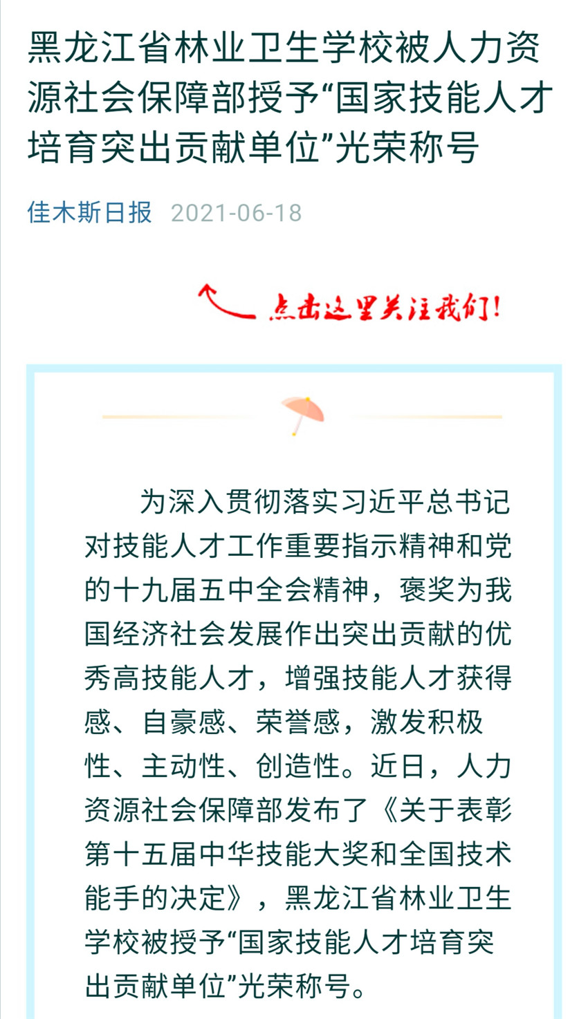 為深入貫徹落實習近平總書記對技能人才工作重要指示精神和黨的十九屆五中全會精神,褒獎為我國經(jīng)濟社會發(fā)展作出突出貢獻的優(yōu)秀高技能人才,增強技能人才獲得感、自豪感、榮譽感,激發(fā)積極性、主動性、創(chuàng)造性。近日,人力資源社會保障部發(fā)布了《關于表彰第十五屆中華技能大獎和全國技術能手的決定》,黑龍江省林業(yè)衛(wèi)生學校被授予“國家技能人才培育突出貢獻單位”光榮稱號。 本次表彰,全國共有30名同志獲得“中華技能大賽”稱號,293名同志獲得“全國技術能手”稱號,64家單位和78名同志為國家技術人才培養(yǎng)工作作出突出貢獻受到通報表揚。 榮譽的取得是對學校教師多年辛苦付出和學生努力學習的充分肯定。近年來學校高度重視技能人才培育工作,以促進職業(yè)技能培訓規(guī)范化、標準化為辦學重點,在高技能人才培育方面取得了顯著成績,先后被授予“黑龍江省高技能人才培養(yǎng)基地”、“黑龍江省大師工作室”等榮譽,此次獲得的獎項是學校在技能人才培育方面取得的最高榮譽。