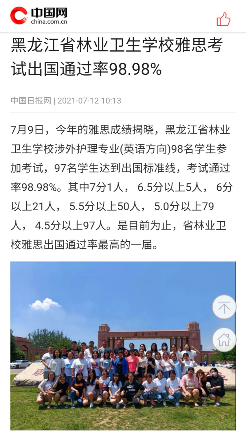 【中國網(wǎng)】黑龍江省林業(yè)衛(wèi)生學(xué)校雅思考試出國通過率98.98% |