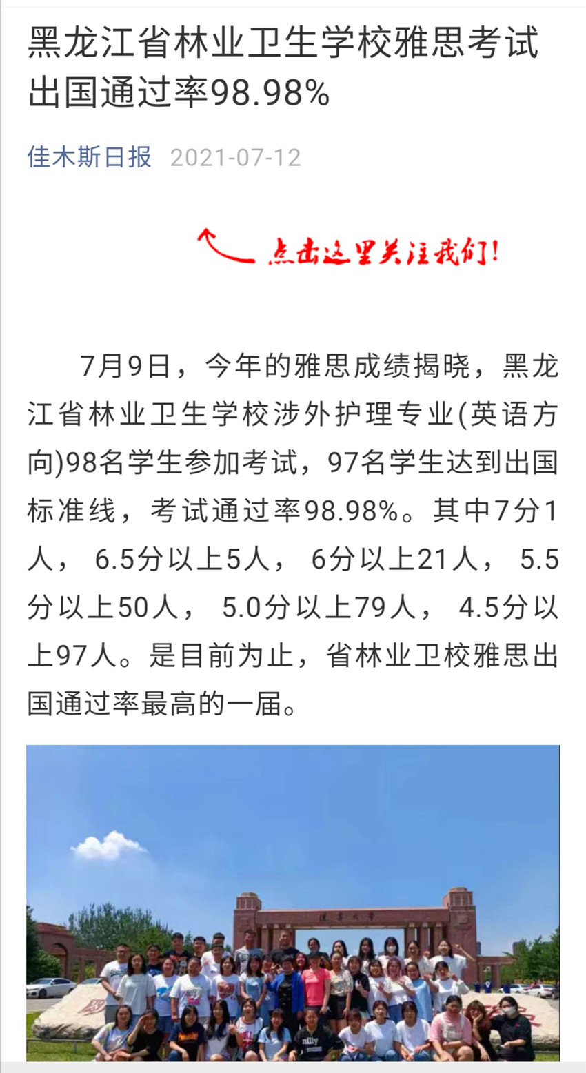 【佳木斯日?qǐng)?bào)】黑龍江省林業(yè)衛(wèi)生學(xué)校雅思考試出國通過率98.98% |