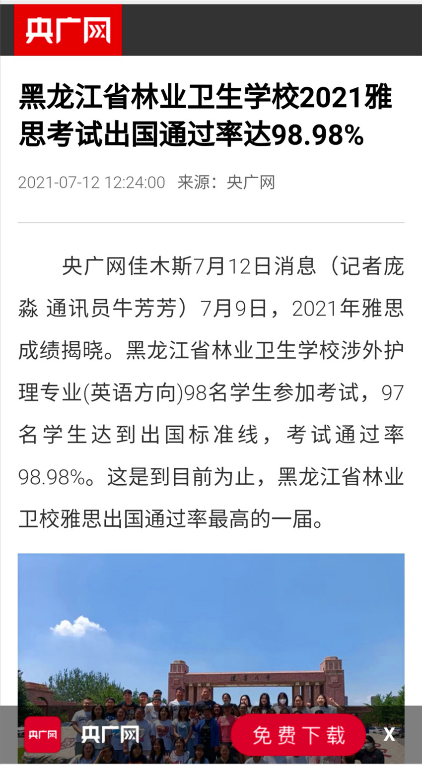 央廣網(wǎng)佳木斯7月12日消息(記者龐淼 通訊員牛芳芳)7月9日,2021年雅思成績揭曉。黑龍江省林業(yè)衛(wèi)生學(xué)校涉外護(hù)理專業(yè)(英語方向)98名學(xué)生參加考試,97名學(xué)生達(dá)到出國標(biāo)準(zhǔn)線,考試通過率98.98%。這是到目前為止,黑龍江省林業(yè)衛(wèi)校雅思出國通過率最高的一屆。