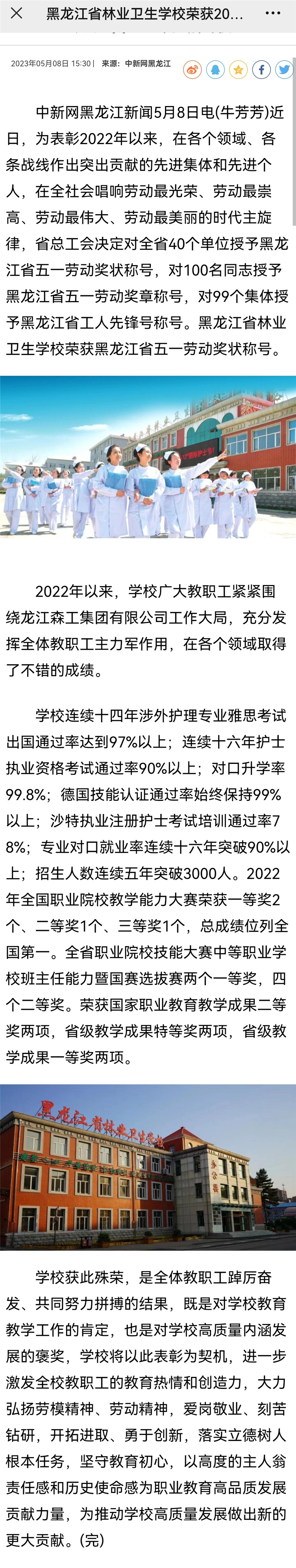 中新網(wǎng)黑龍江新聞5月8日電(牛芳芳)近日,為表彰2022年以來,在各個領(lǐng)域、各條戰(zhàn)線作出突出貢獻(xiàn)的先進(jìn)集體和先進(jìn)個人,在全社會唱響勞動最光榮、勞動最崇高、勞動最偉大、勞動最美麗的時代主旋律,省總工會決定對全省40個單位授予黑龍江省五一勞動獎狀稱號,對100名同志授予黑龍江省五一勞動獎?wù)路Q號,對99個集體授予黑龍江省工人先鋒號稱號。黑龍江省林業(yè)衛(wèi)生學(xué)校榮獲黑龍江省五一勞動獎狀稱號。