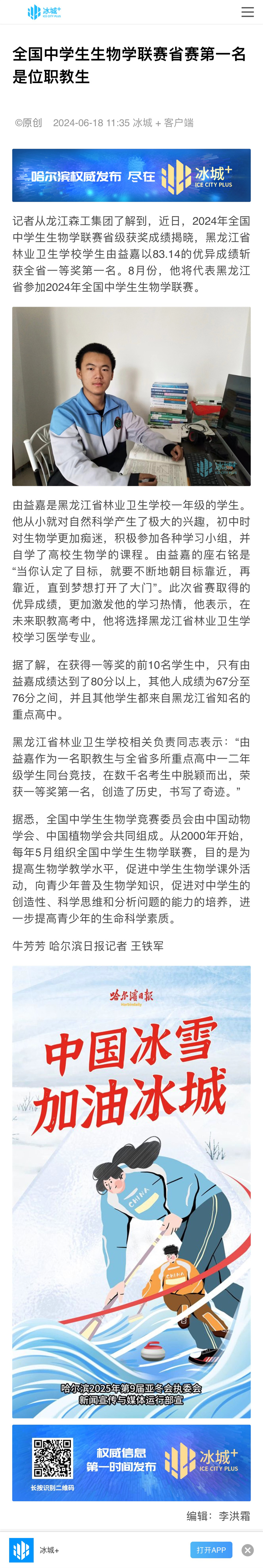 【哈爾濱新聞網(wǎng)】全國中學(xué)生生物學(xué)聯(lián)賽省賽第一名是位職教生