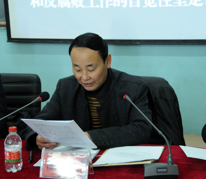 隨后,陳書記帶領(lǐng)全校黨員、中層領(lǐng)導(dǎo)干部共同學(xué)習(xí)了十八屆中紀(jì)委三次全會、十一屆省紀(jì)委四次會議精神,他指出:黨員、領(lǐng)導(dǎo)干部要加強(qiáng)學(xué)習(xí),筑牢反腐倡廉的思想防線,搞好“三個教育”,即思想宗旨教育,卡住思想道德“防線”;開展黨紀(jì)法規(guī)教育,把住法律“紅線”;開展廉潔自律教育,守住做人“底線”。在工作中要抓住重點(diǎn),加強(qiáng)監(jiān)督;突破難點(diǎn),令行禁止;執(zhí)行制度,嚴(yán)明紀(jì)律;加大校務(wù)公開力度,讓權(quán)力在陽光下運(yùn)作。