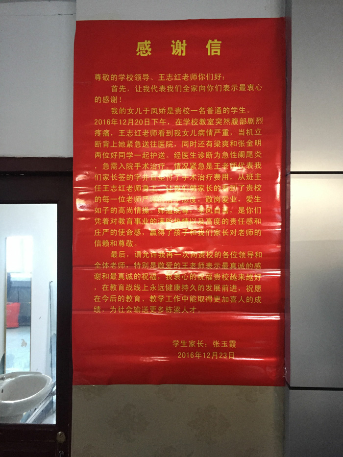 12月20日下午,15級(jí)貫通三班正在上自習(xí)課的于鳳嬌同學(xué)突然肚子疼,渾身出汗,四肢癱軟,班主任王老師發(fā)現(xiàn)情況危急,立即把學(xué)生送到了我市最好的醫(yī)院,并墊付了醫(yī)療費(fèi)。檢查發(fā)現(xiàn)該同學(xué)為急性闌尾炎,隨時(shí)都有穿孔的危險(xiǎn),王老師在與家長(zhǎng)溝通后當(dāng)機(jī)立斷為孩子安排了手術(shù)。手術(shù)直至半夜才結(jié)束,王老師又在孩子身邊守護(hù)了整整一夜,直到第二天孩子的家長(zhǎng)到來才離開醫(yī)院。