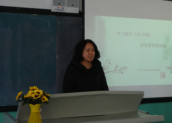 二校區(qū)黃秀英主任分享的主題是學(xué)習(xí)踐行《弟子規(guī)》。二校區(qū)年級(jí)辦秉承傳統(tǒng)文化教育,創(chuàng)新德育工作,以《弟子規(guī)》為載體,進(jìn)行了例如“日行一善”等系列主題教育活動(dòng)。班主任以身示范,帶動(dòng)影響學(xué)生,并收到良好效果。