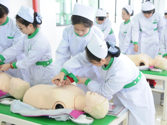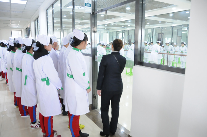 灰蒙蒙的天氣并沒有影響同學(xué)們參觀的熱情,他們精神飽滿地走進(jìn)了我校護(hù)理實(shí)訓(xùn)樓。首先,在我校護(hù)理教師的引導(dǎo)下同學(xué)們穿上了護(hù)士服,并學(xué)習(xí)了基本的護(hù)理禮儀常識(shí)。為了讓同學(xué)們深入地了解醫(yī)院的工作環(huán)境,深入體驗(yàn)醫(yī)護(hù)工作,在我校教師的帶領(lǐng)下同學(xué)們參觀了護(hù)理實(shí)訓(xùn)樓。短時(shí)間的參觀并不能滿足同學(xué)們強(qiáng)烈的求知欲。為此,我校在實(shí)訓(xùn)樓三樓會(huì)議室為同學(xué)們訂制了知識(shí)講堂,向同學(xué)們介紹了相關(guān)的急救和護(hù)理知識(shí)。隨后,在護(hù)理教師的指導(dǎo)下,同學(xué)們進(jìn)行了心肺復(fù)蘇術(shù)與血壓測量的實(shí)踐操作。