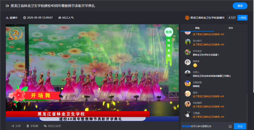 2020年9月11日,黑龍江省林業(yè)衛(wèi)生學(xué)校舉行建校四十周年慶典暨教師節(jié)表彰開學(xué)典禮,網(wǎng)絡(luò)信息中心全體教師成功地完成了本次慶典的現(xiàn)場直播及二、三、四校區(qū)共71個班級同步收看任務(wù)。 網(wǎng)絡(luò)信息中心至2013年承擔(dān)校園直播任務(wù)以來不斷創(chuàng)新工作,在原有的基礎(chǔ)上今年增加機位,運用光纖轉(zhuǎn)換技術(shù)、推流拉流技術(shù),多角度同步傳輸畫面使布局更加合理。更換了云直播服務(wù)商,直播更加清晰流暢,增加線上實時互動、榜單等多項功能。校友們線上參會通過留言、點贊、鼓掌等方式表達自己對母校深厚的感情。至慶典結(jié)束訪問量已達2.17萬,除甘肅、寧夏外遍布全國各個省、直轄市。 校園文化直播已經(jīng)成為對外宣傳學(xué)校的重要窗口之一,網(wǎng)絡(luò)信息中心全體教師會不斷加強業(yè)務(wù)學(xué)習(xí)創(chuàng)新工作,為學(xué)校教育教學(xué)、辦公提供一流的技術(shù)支撐。