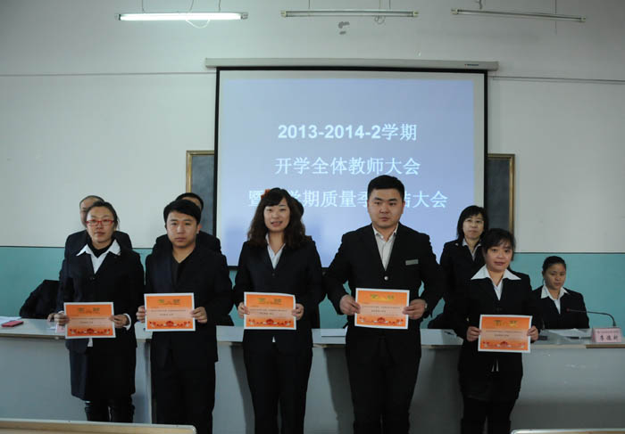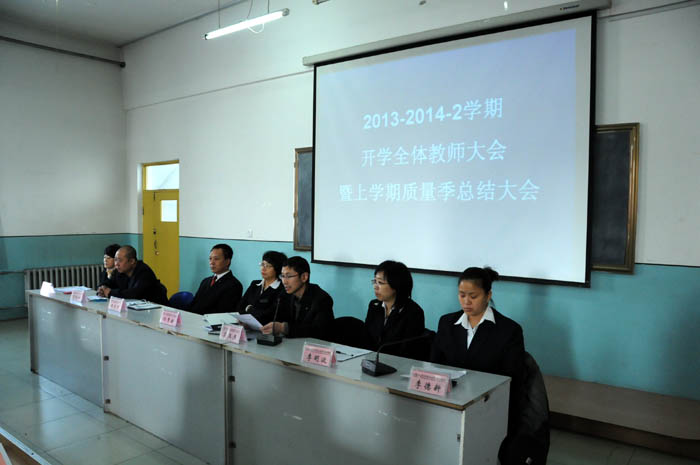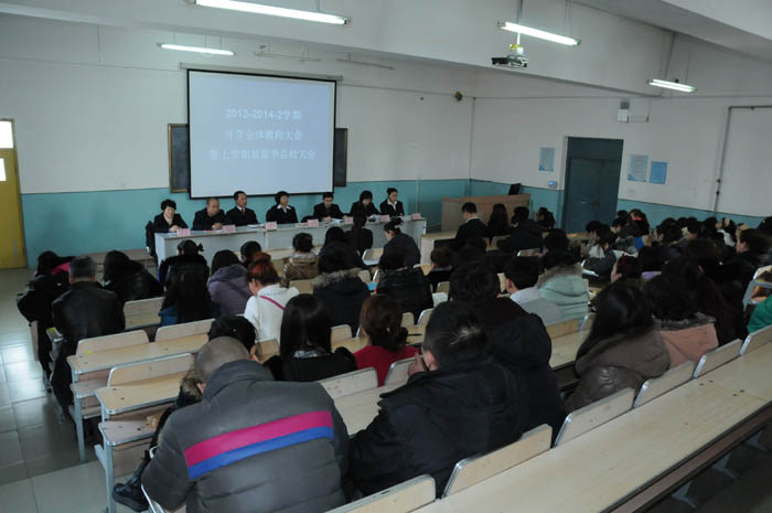 2月24日下午, 在我校主校區(qū)階梯教室召開了2013-2014第二學(xué)期全體教師大會及暨上學(xué)期教學(xué)質(zhì)量季總結(jié)大會。副校長孫秀敏、教學(xué)黨支部書記王曉杰、教務(wù)科科長李明波、考試辦主任玄花、督導(dǎo)辦主任高漢杰、素養(yǎng)辦主任丁建洪及全體任課教師參加了此次會議,會議由教務(wù)科副科長李德新主持。