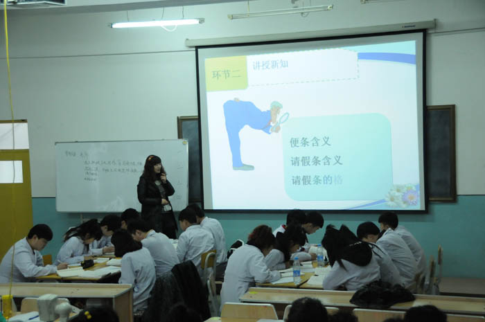 牛芳芳老師展示的是應(yīng)用文寫(xiě)作——《便條》,整個(gè)課堂環(huán)環(huán)相扣,教師的主導(dǎo)地位和學(xué)生的主體地位體現(xiàn)得非常明顯。整節(jié)課采取合作學(xué)習(xí)和小組競(jìng)賽的方式,課堂氣氛極其活躍。真正做到了在情境中學(xué)知識(shí),在練習(xí)中提能力。