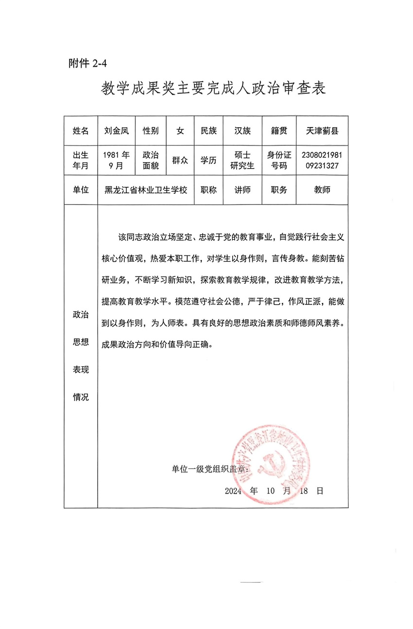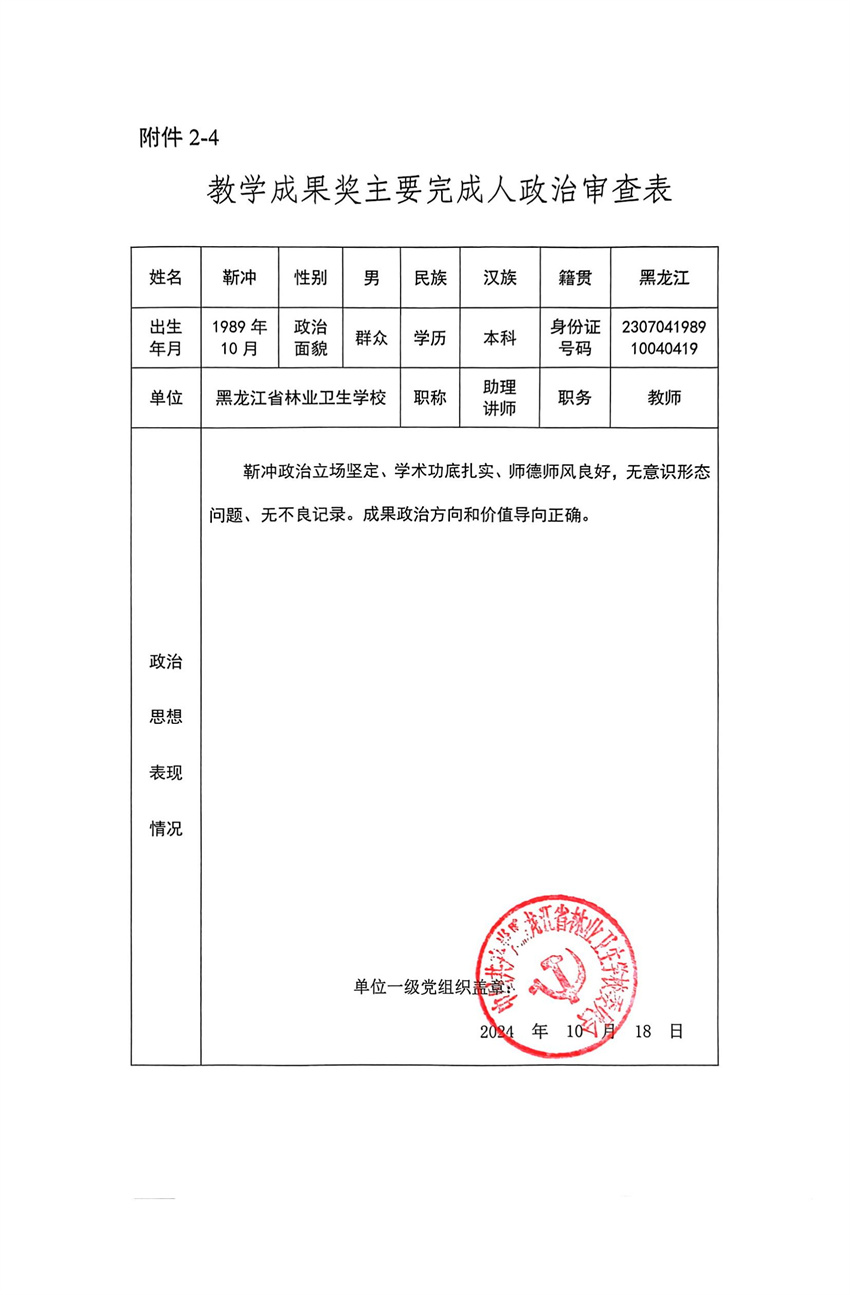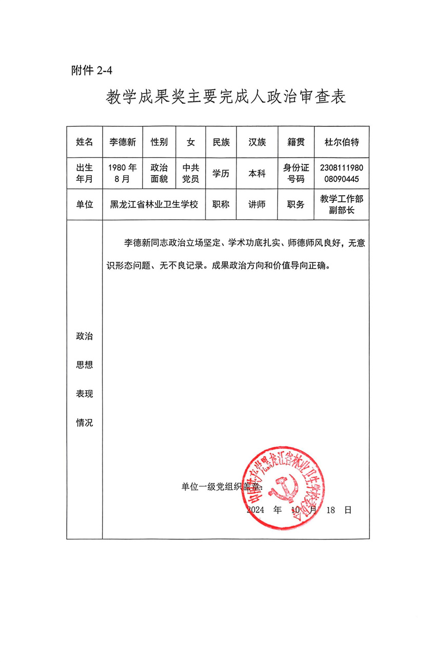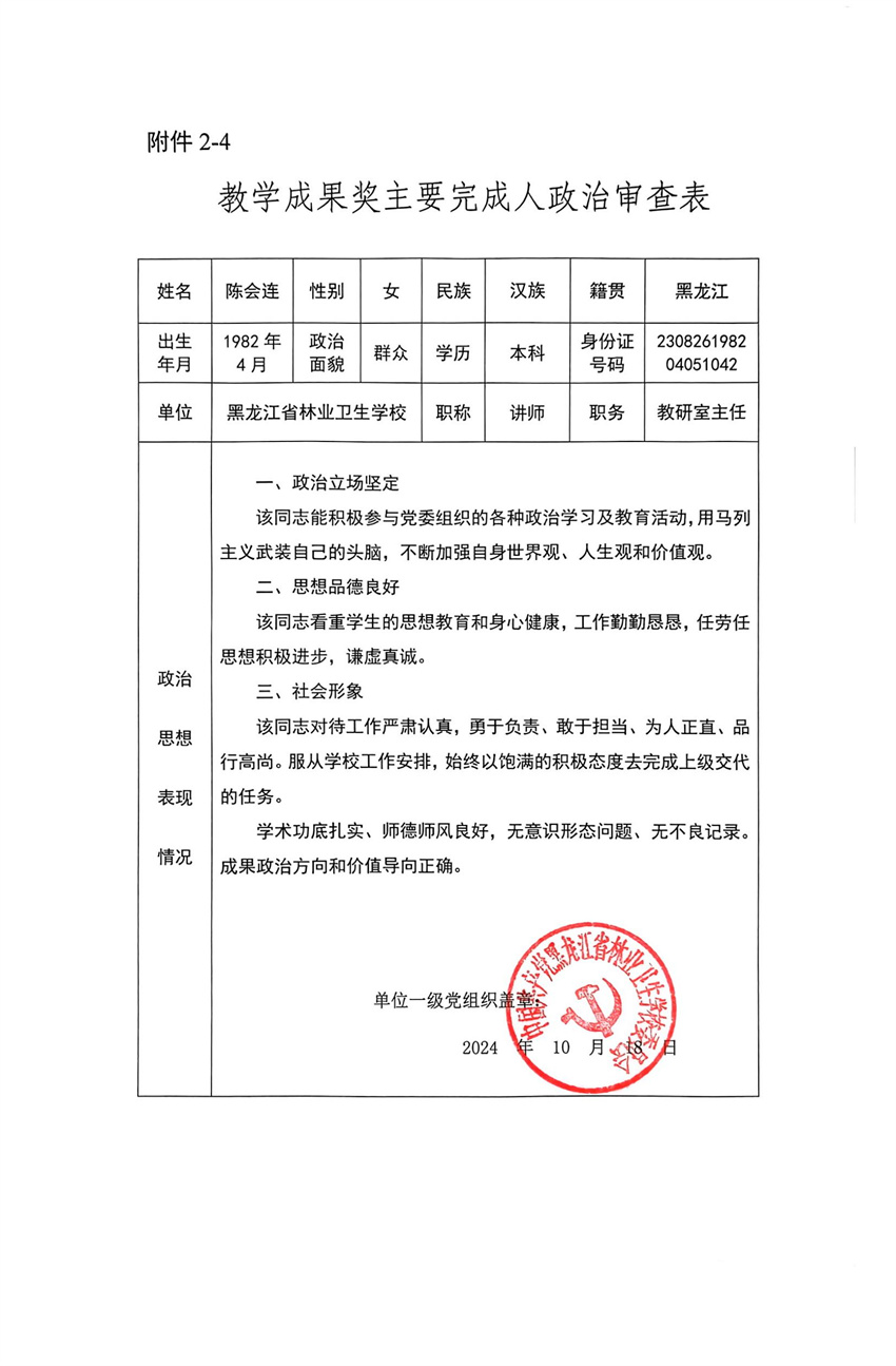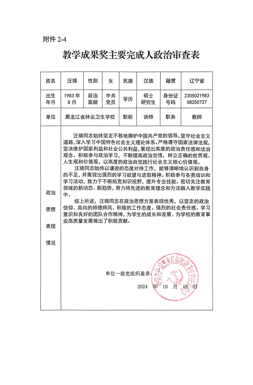2024年黑龍江省職業(yè)教育教學(xué)成果獎(jiǎng)主要完成人政治審查表